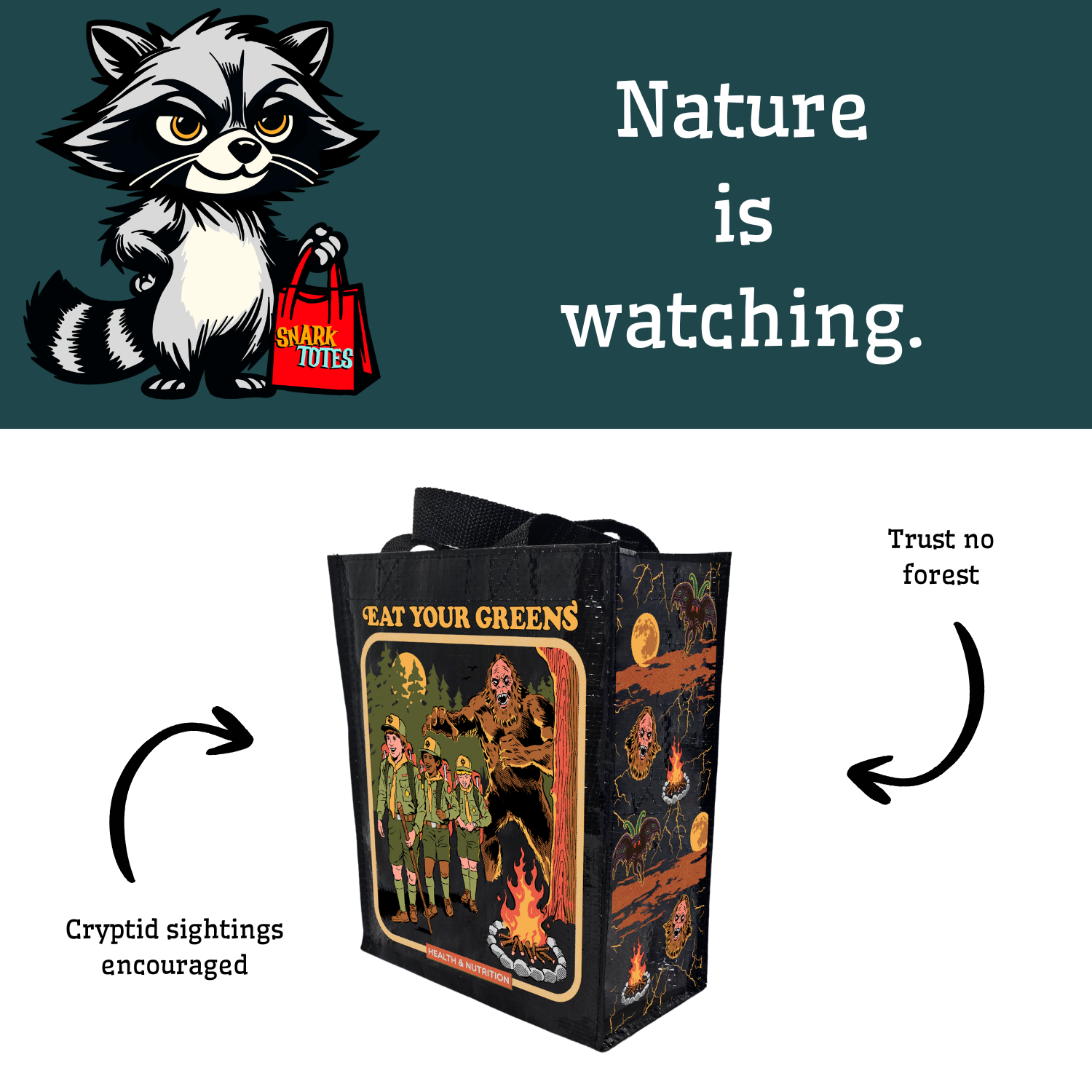 Nothing says “core memory” like camping with an unspeakable entity lurking nearby. The Cryptid Campout Ready Tote celebrates outdoor adventure, environmental responsibility, and cryptid-adjacent anxiety.